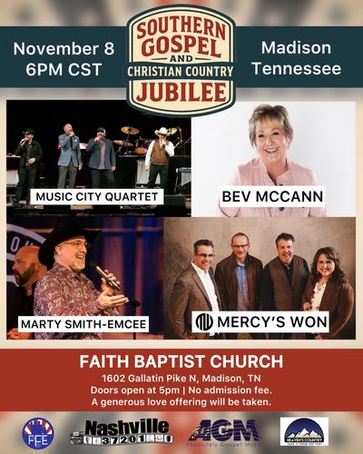 You're invited to a free concert at Faith Baptist Church this Saturday night, November 8th. See The Music City Quartet. Bev McCann and Mercy's Won in concert this Saturday night! The church is located at 1602 Gallatin Pike N in Madison, TN. The concert is free, a generous love offering will be taken. Sponsored by Nashville 37201, Family Friendly Entertainment, Absolutely Gospel Music and Heaven's Country! Take It From The Top!